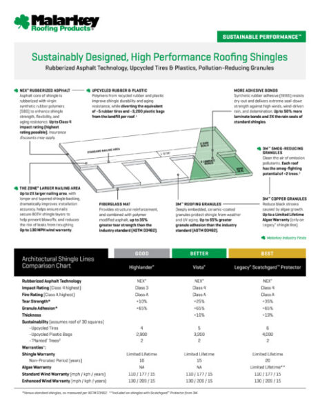 Incorporating upcycled tires and plastic bags to increase strength and durability, while reducing landfill waste, and integrating smog-reducing granules that help clean the air, Malarkey shingles are designed with the environment in mind.