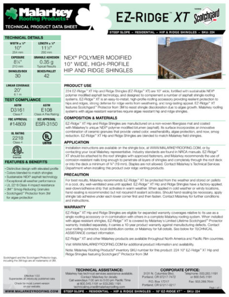 EZ-Ridge® is eligible for expanded warranty coverages relative to its use as a single roofing accessory or in combination with others in a complete Malarkey roofing system. When installed with algae resistant shingles, EZ-Ridge® is covered by Malarkey’s Limited Lifetime Scotchgard™ Protector Warranty. Installed separately, it carries a 10-year product warranty against manufacturing defects. Contact Malarkey’s Technical Services Department for details.